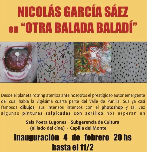 En un pueblo donde la gran mayoría de sus pobladores y visitantes asegura (además del avistaje de ovnis en los alrededores del Uritorco y la conversación secreta con duendes y hadas variopintas) sentirse bendecido/a, agradecido/a, elegido/a, consentido/a por el Cosmos y todo alrededor de su aura magnética y mágica… yo puedo admitir y/o recordar que, aquella noche en la que inauguré mi exposición personal en una sala mítica de Capilla del Monte, experimenté una gran alegría al ver a una ingente cantidad de público asistiendo a paladear mis pinturas, apreciar mis dibujos y mis intentos de mezclar lo mencionado con los recursos digitales que había en aquel entonces. Recuerdo, con alegría redoblada, la venta de buena parte de lo expuesto, el jaleo y la algarabía de una banda de funky en vivo, el de mis amistades y el de encantadores ignotos e ignotas que brindaban e ingerían lo que mi ex y yo habíamos preparado y ofrecido para tan grato acontecimiento. En medio de aquel dulce tumulto, la aparición sorpresiva de mi amigo, el legendario pintor Miguel Ocampo, que se desplazó decenas de kilómetros para asistir a la inauguración.