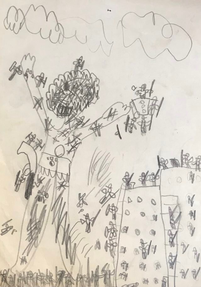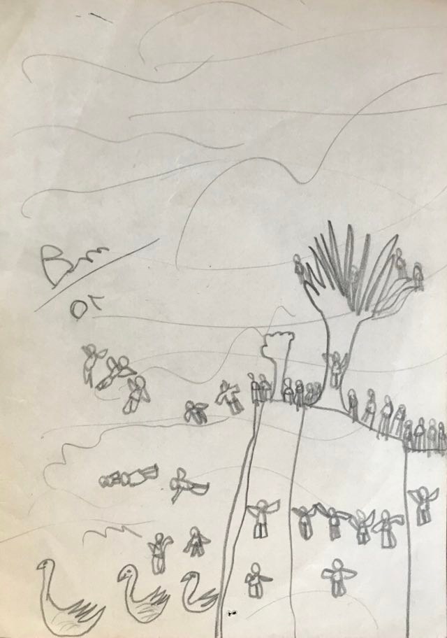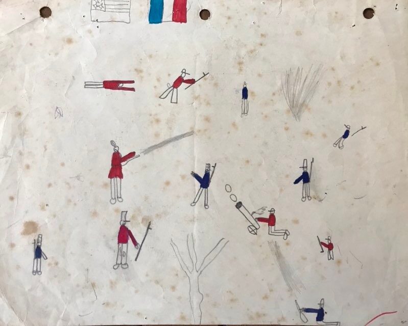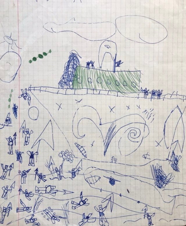 Por esa época también dibujé la tercera imagen que aparece aquí: flechas, granaderos, una ballenita con sonrisa de azafata y un Titanic barroco que escapó del iceberg
