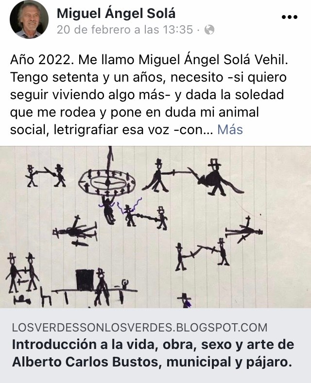 Desde Madrid, la genial creación de Miguel Ángel Solá acompañada con una selección de los dibujos de mi infancia. Entregas lúdicas e inéditas que desbordan talento y se publican en el prestigioso blog del Colectivo Cultural de Los Verdes Platónicos & Paralelos y en redes sociales afines.