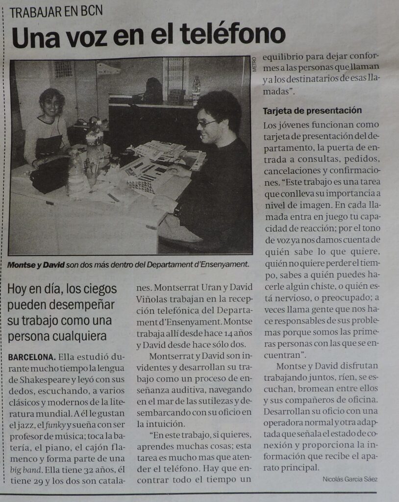 Ella estudió durante mucho tiempo la lengua de Shakespeare y leyó, escuchando con sus dedos, a varios clásicos modernos de la literatura mundial. A él le gustan el jazz, el funky y sueña con ser profesor de música: toca la batería, el piano, el cajón flamenco y forma parte de una big band. Ella tiene 32, el tiene 29 y los dos son catalanes. Montserrat U. y David V. trabajan en la recepción telefónica del Departament d’Ensenyament de Barcelona. Monste trabaja allí desde hace 14 años y David desde hace sólo dos.